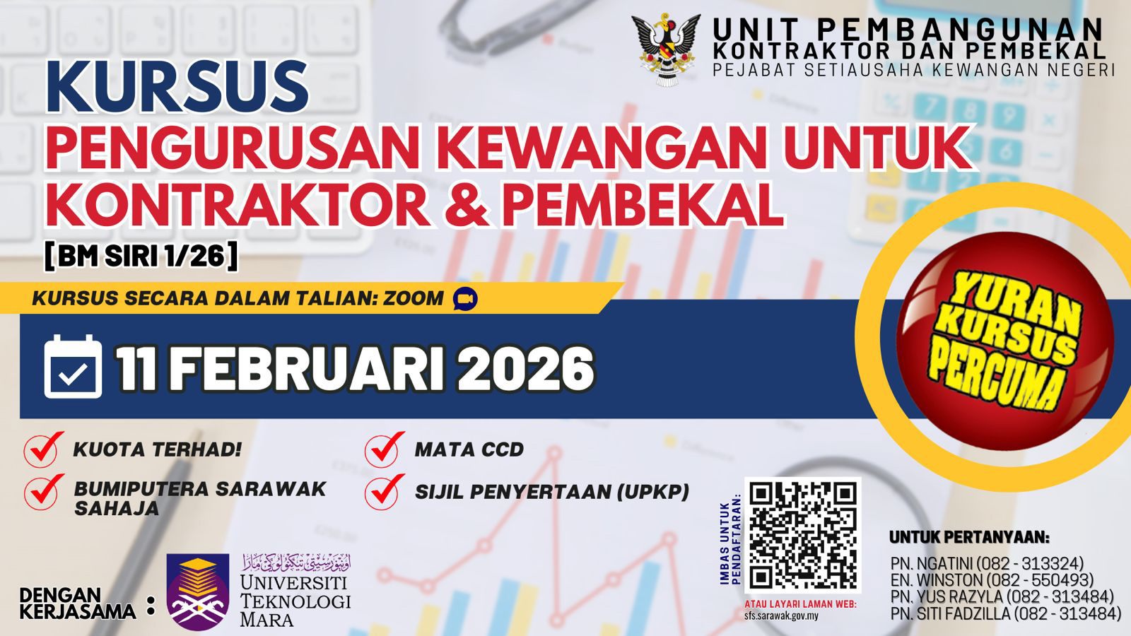 11.02.2026 - Kursus Pengurusan Kewangan untuk Kontraktor dan Pembekal [BM Siri 1/26] secara dalam talian (Online) pada 11.02.2026. Penceramah: Universiti Teknologi Mara (UiTM) Sarawak SILA KLIK UNTUK PENDAFTARAN